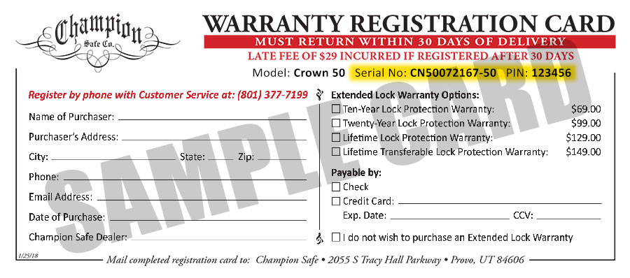 NOTE: Only owners who have safes that contain a registration card with a PIN number are eligible for online registration (see yellow highlight below). Lock warranties must be purchased at time of safe registration. If your new safe purchase did not contain a registration card with PIN number you will need to mail in your registration information. Call Customer Service at (801) 377-7199 for further details.
